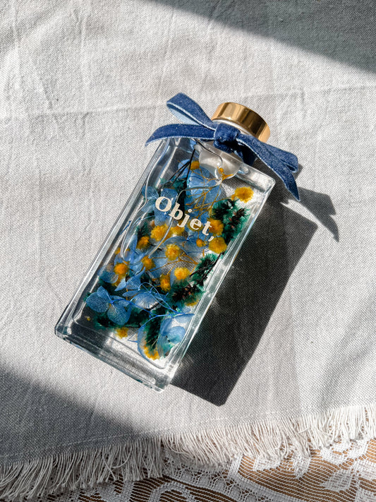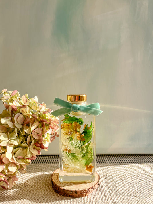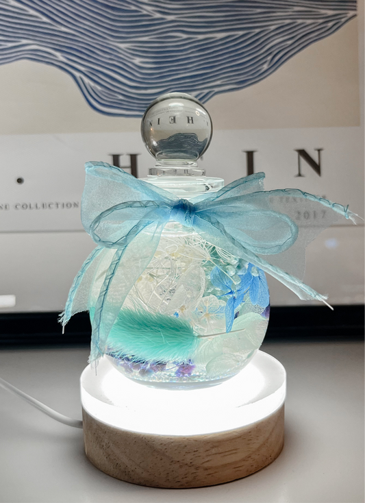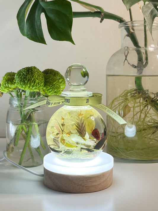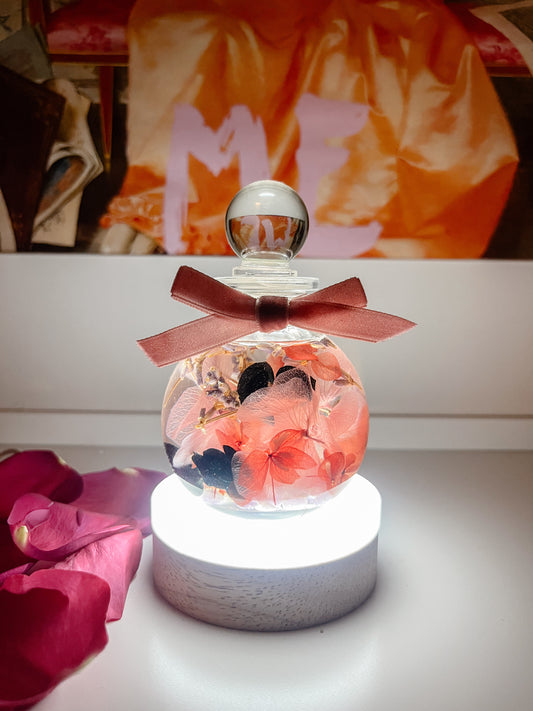 Preserved and dried flowers, foliage in the glass with special liquid with LED Lamp.